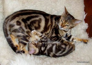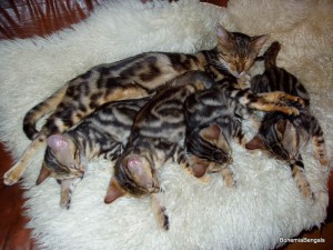 She has big rosettes, good contrast and very hot color. She is a great mother. Kittens "F" is her last litter.